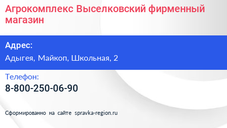 Агрокомплекс Выселковский, фирменный магазин по адресу Адыгея, Майкоп, Школьная, 2 в дальнейшем Организация, размещена в следующих категориях: