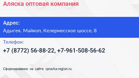Аляска, оптовая компания по адресу Адыгея, Майкоп, Келермесское шоссе, 8 в дальнейшем Организация, размещена в следующих категориях: