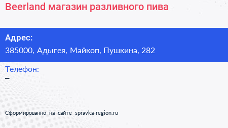Beerland, магазин разливного пива по адресу 385000, Адыгея, Майкоп, Пушкина, 282 в дальнейшем Организация, размещена в следующих категориях: