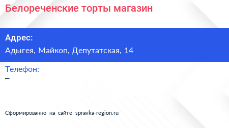 Белореченские торты, магазин по адресу Адыгея, Майкоп, Депутатская, 14 в дальнейшем Организация, размещена в следующих категориях: