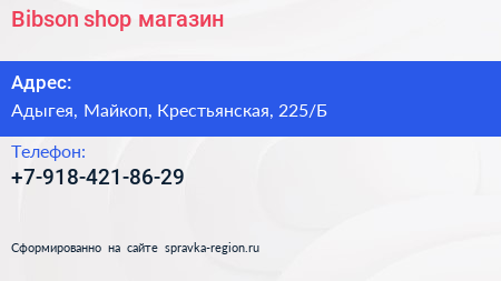 Bibson shop, магазин по адресу Адыгея, Майкоп, Крестьянская, 225/Б в дальнейшем Организация, размещена в следующих категориях: