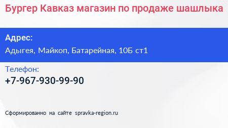 Бургер Кавказ, магазин по продаже шашлыка по адресу Адыгея, Майкоп, Батарейная, 10Б ст1 в дальнейшем Организация, размещена в следующих категориях:
