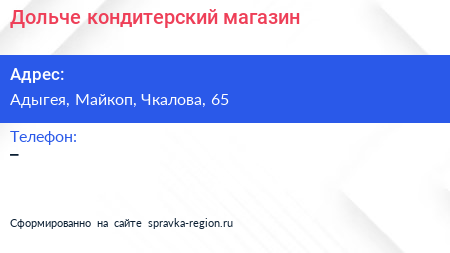 Дольче, кондитерский магазин по адресу Адыгея, Майкоп, Чкалова, 65 в дальнейшем Организация, размещена в следующих категориях: