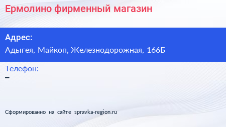 Ермолино, фирменный магазин по адресу Адыгея, Майкоп, Железнодорожная, 166Б в дальнейшем Организация, размещена в следующих категориях: