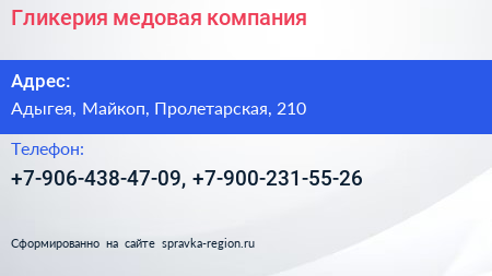 Гликерия, медовая компания по адресу Адыгея, Майкоп, Пролетарская, 210 в дальнейшем Организация, размещена в следующих категориях: