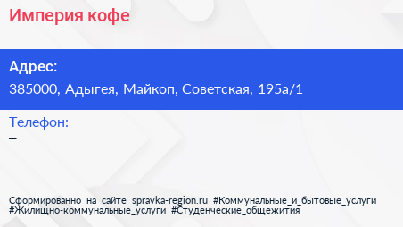 Империя кофе по адресу 385000, Адыгея, Майкоп, Советская, 195а/1 в дальнейшем Организация, размещена в следующих категориях: