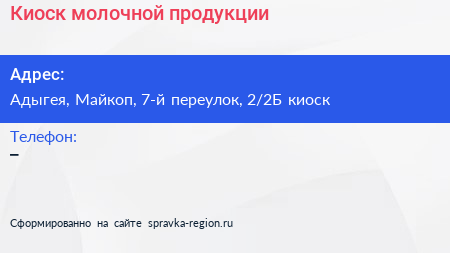 Киоск молочной продукции по адресу Адыгея, Майкоп, 7-й переулок, 2/2Б киоск в дальнейшем Организация, размещена в следующих категориях: