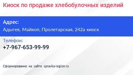 Киоск по продаже хлебобулочных изделий по адресу Адыгея, Майкоп, Пролетарская, 242а киоск в дальнейшем Организация, размещена в следующих категориях:
