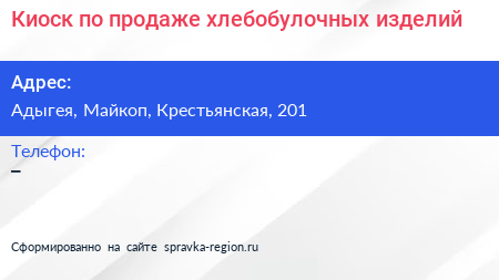 Киоск по продаже хлебобулочных изделий по адресу Адыгея, Майкоп, Крестьянская, 201 в дальнейшем Организация, размещена в следующих категориях: