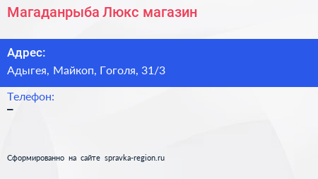 Магаданрыба Люкс, магазин по адресу Адыгея, Майкоп, Гоголя, 31/3 в дальнейшем Организация, размещена в следующих категориях: