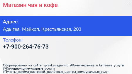 Магазин чая и кофе по адресу Адыгея, Майкоп, Крестьянская, 203 в дальнейшем Организация, размещена в следующих категориях: