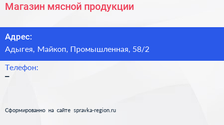 Магазин мясной продукции по адресу Адыгея, Майкоп, Промышленная, 58/2 в дальнейшем Организация, размещена в следующих категориях: