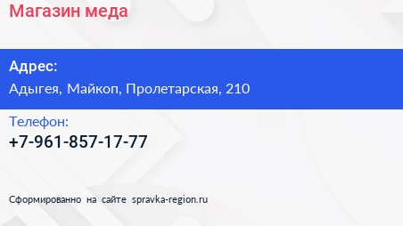 Магазин меда по адресу Адыгея, Майкоп, Пролетарская, 210 в дальнейшем Организация, размещена в следующих категориях: