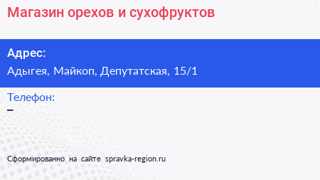 Магазин орехов и сухофруктов по адресу Адыгея, Майкоп, Депутатская, 15/1 в дальнейшем Организация, размещена в следующих категориях:
