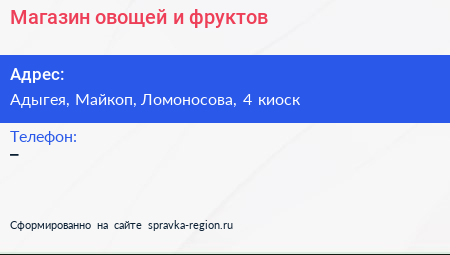 Магазин овощей и фруктов по адресу Адыгея, Майкоп, Ломоносова, 4 киоск в дальнейшем Организация, размещена в следующих категориях: