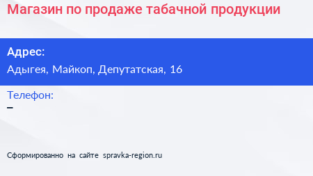 Магазин по продаже табачной продукции по адресу Адыгея, Майкоп, Депутатская, 16 в дальнейшем Организация, размещена в следующих категориях: