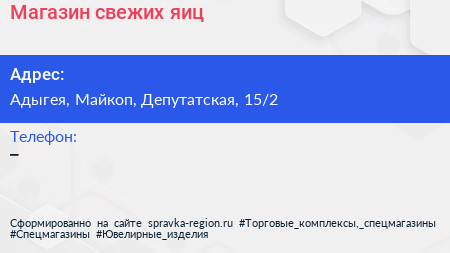 Магазин свежих яиц по адресу Адыгея, Майкоп, Депутатская, 15/2 в дальнейшем Организация, размещена в следующих категориях:
