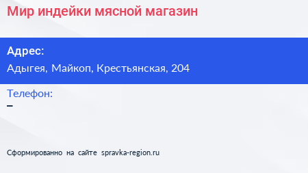 Мир индейки, мясной магазин по адресу Адыгея, Майкоп, Крестьянская, 204 в дальнейшем Организация, размещена в следующих категориях: