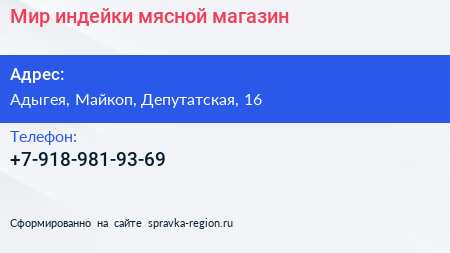 Мир индейки, мясной магазин по адресу Адыгея, Майкоп, Депутатская, 16 в дальнейшем Организация, размещена в следующих категориях:
