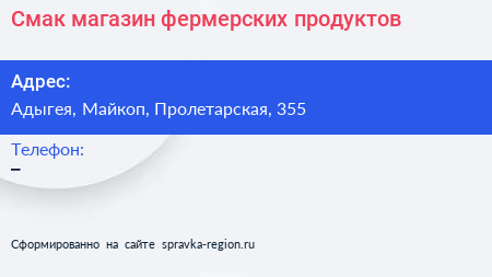 Смак, магазин фермерских продуктов по адресу Адыгея, Майкоп, Пролетарская, 355 в дальнейшем Организация, размещена в следующих категориях:
