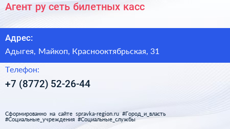 Агент.ру, сеть билетных касс по адресу Адыгея, Майкоп, Краснооктябрьская, 31 в дальнейшем Организация, размещена в следующих категориях: