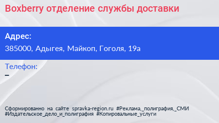 Boxberry, отделение службы доставки по адресу 385000, Адыгея, Майкоп, Гоголя, 19а в дальнейшем Организация, размещена в следующих категориях:
