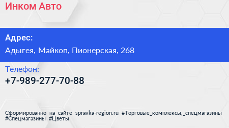 Инком-Авто по адресу Адыгея, Майкоп, Пионерская, 268 в дальнейшем Организация, размещена в следующих категориях:
