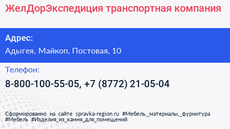 ЖелДорЭкспедиция, транспортная компания по адресу Адыгея, Майкоп, Постовая, 10 в дальнейшем Организация, размещена в следующих категориях: