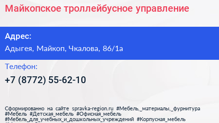 Майкопское троллейбусное управление по адресу Адыгея, Майкоп, Чкалова, 86/1а в дальнейшем Организация, размещена в следующих категориях: