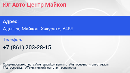 Юг-Авто Центр Майкоп по адресу Адыгея, Майкоп, Хакурате, 648Б в дальнейшем Организация, размещена в следующих категориях: