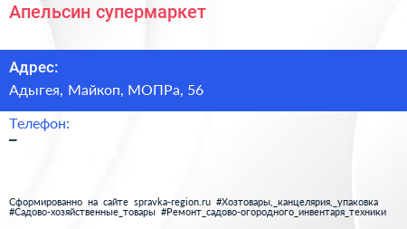 Апельсин, супермаркет по адресу Адыгея, Майкоп, МОПРа, 56 в дальнейшем Организация, размещена в следующих категориях: