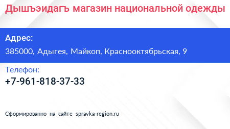 Дышъэидагъ, магазин национальной одежды по адресу 385000, Адыгея, Майкоп, Краснооктябрьская, 9 в дальнейшем Организация, размещена в следующих категориях: