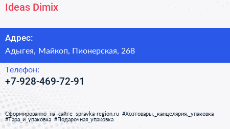 Ideas Dimix по адресу Адыгея, Майкоп, Пионерская, 268 в дальнейшем Организация, размещена в следующих категориях: