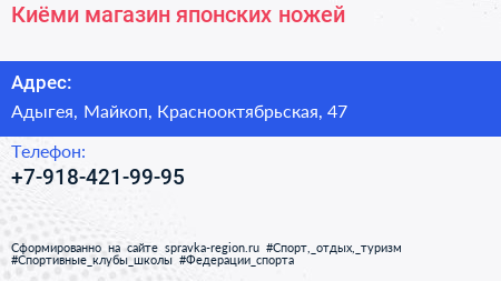 Киёми, магазин японских ножей по адресу Адыгея, Майкоп, Краснооктябрьская, 47 в дальнейшем Организация, размещена в следующих категориях: