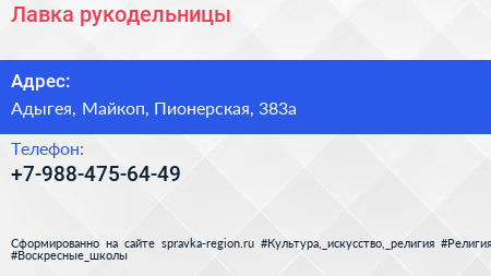 Лавка рукодельницы по адресу Адыгея, Майкоп, Пионерская, 383а в дальнейшем Организация, размещена в следующих категориях: