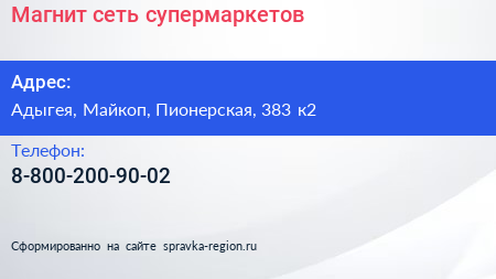 Магнит, сеть супермаркетов по адресу Адыгея, Майкоп, Пионерская, 383 к2 в дальнейшем Организация, размещена в следующих категориях: