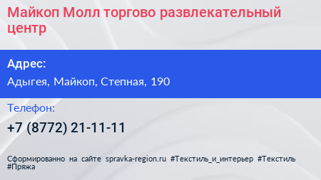 Майкоп Молл, торгово-развлекательный центр по адресу Адыгея, Майкоп, Степная, 190 в дальнейшем Организация, размещена в следующих категориях: