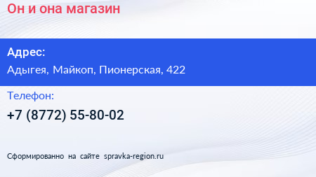 Он и она, магазин по адресу Адыгея, Майкоп, Пионерская, 422 в дальнейшем Организация, размещена в следующих категориях: