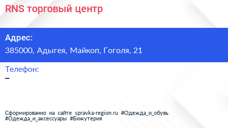 RNS, торговый центр по адресу 385000, Адыгея, Майкоп, Гоголя, 21 в дальнейшем Организация, размещена в следующих категориях: