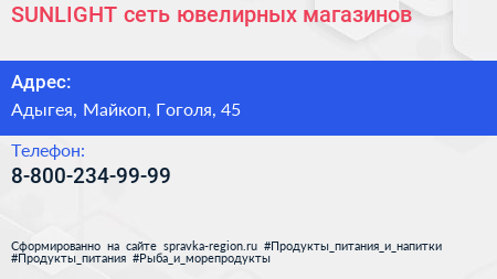 SUNLIGHT, сеть ювелирных магазинов по адресу Адыгея, Майкоп, Гоголя, 45 в дальнейшем Организация, размещена в следующих категориях: