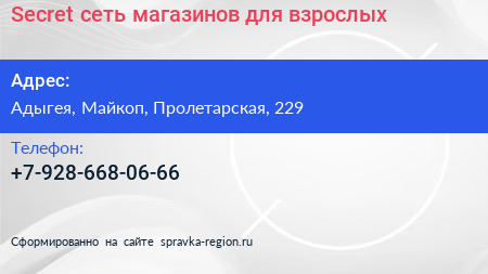 Secret, сеть магазинов для взрослых по адресу Адыгея, Майкоп, Пролетарская, 229 в дальнейшем Организация, размещена в следующих категориях: