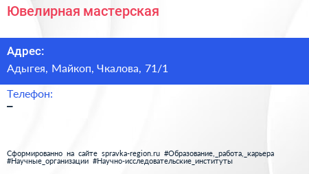 Ювелирная мастерская по адресу Адыгея, Майкоп, Чкалова, 71/1 в дальнейшем Организация, размещена в следующих категориях: