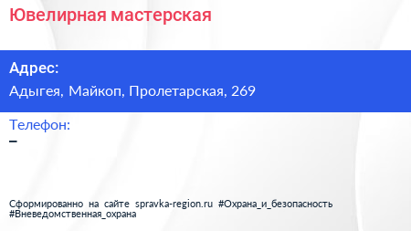 Ювелирная мастерская по адресу Адыгея, Майкоп, Пролетарская, 269 в дальнейшем Организация, размещена в следующих категориях: