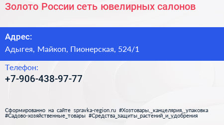 Золото России, сеть ювелирных салонов по адресу Адыгея, Майкоп, Пионерская, 524/1 в дальнейшем Организация, размещена в следующих категориях: