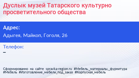 Дуслык, музей Татарского культурно-просветительного общества по адресу Адыгея, Майкоп, Гоголя, 26 в дальнейшем Организация, размещена в следующих категориях: