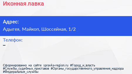 Иконная лавка по адресу Адыгея, Майкоп, Шоссейная, 1/2 в дальнейшем Организация, размещена в следующих категориях: