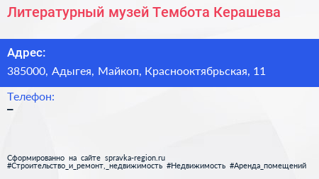Литературный музей Тембота Керашева по адресу 385000, Адыгея, Майкоп, Краснооктябрьская, 11 в дальнейшем Организация, размещена в следующих категориях: