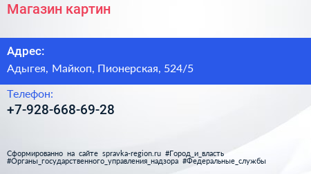 Магазин картин по адресу Адыгея, Майкоп, Пионерская, 524/5 в дальнейшем Организация, размещена в следующих категориях: