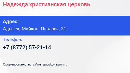 Надежда, христианская церковь по адресу Адыгея, Майкоп, Павлова, 31 в дальнейшем Организация, размещена в следующих категориях: