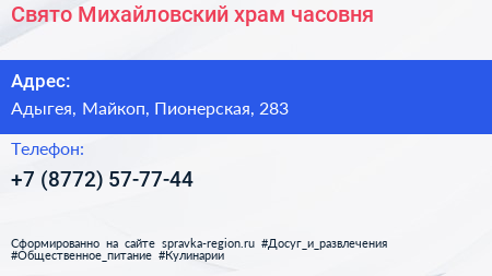 Свято-Михайловский храм-часовня по адресу Адыгея, Майкоп, Пионерская, 283 в дальнейшем Организация, размещена в следующих категориях:
